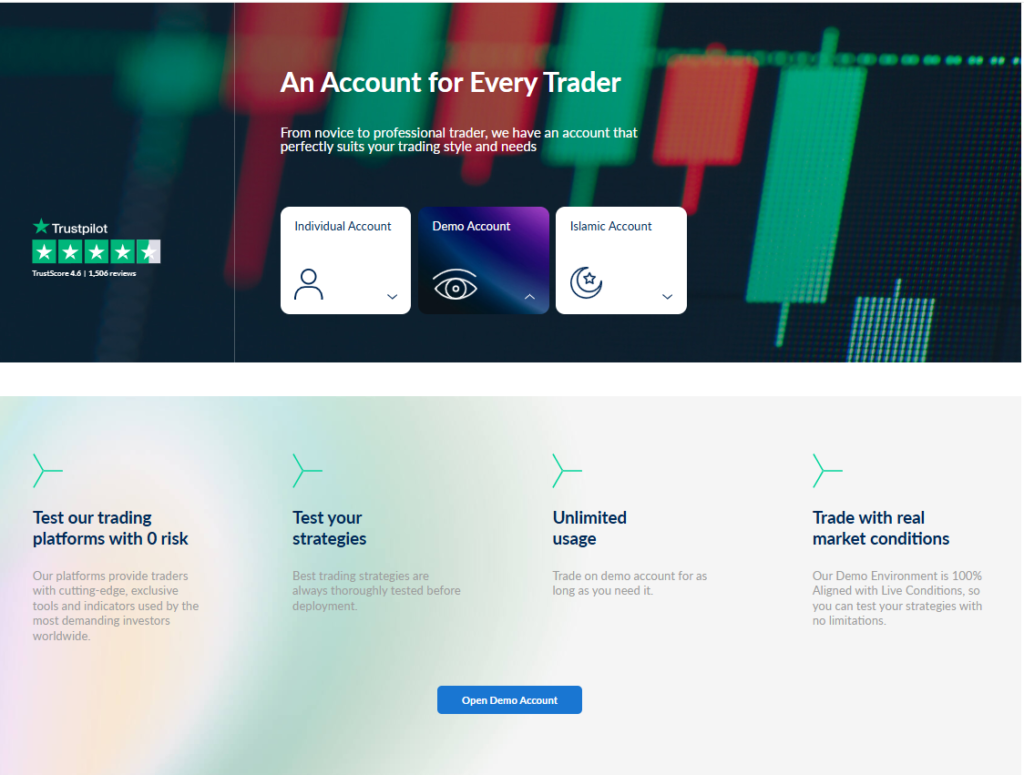As already mentioned, the broker only offers Individual and Islamic account types. The minimum initial deposit required to open the individual account is $1,000. Which is pretty high compared to other brokers. There are 4 account currencies you can choose from, USD, EUR, GBP, and CHF. If you use Euro on a daily basis, it’s better to choose EUR as an account currency to save on conversion fees when withdrawing or depositing money.