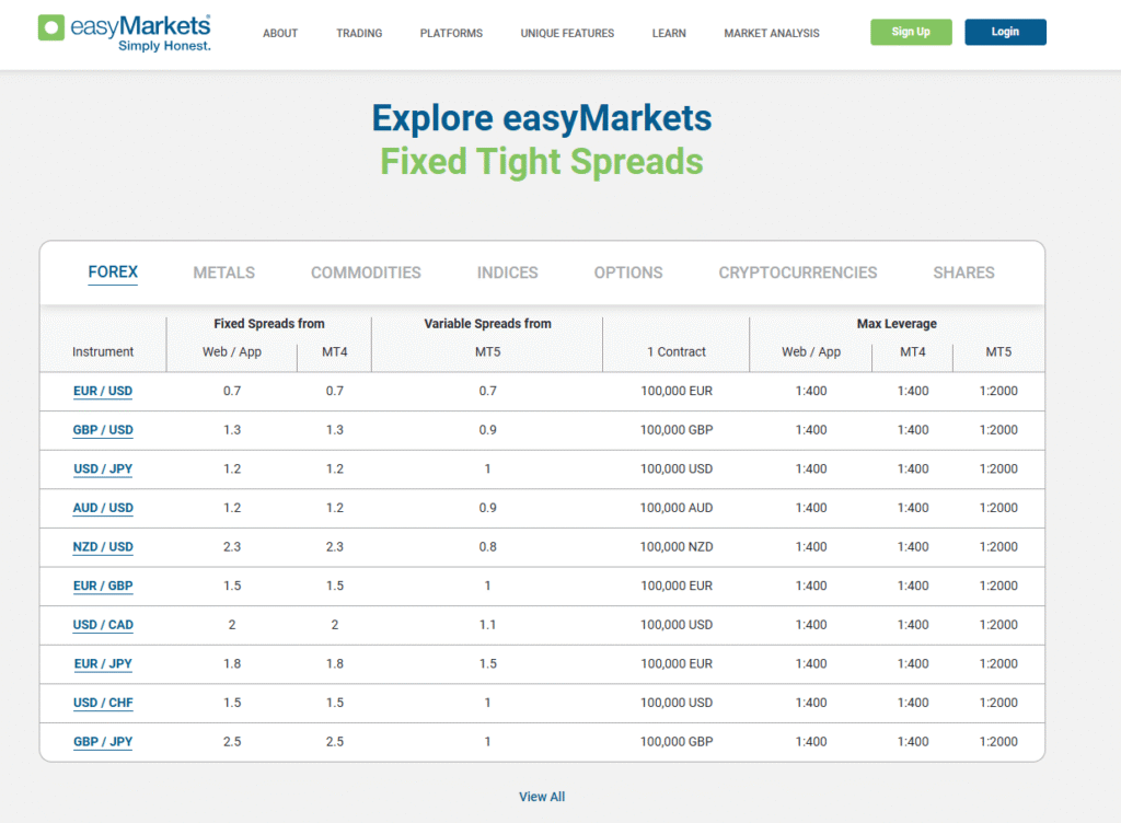 The number of trading instruments offered by easyMarkets is moderate. Despite this, there are still various instruments available for trading spanning different asset classes. Forex, cryptos, and share CFDs are all present and will enable traders to find something worthwhile. There are 63 Forex pairs, which is a good amount when looking at currency trading platforms. From the table above, it is clear that the broker mainly focuses on Forex and despite having some CFDs available, they are limited.