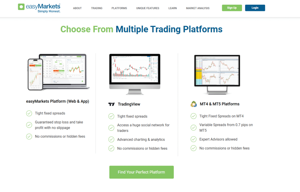 The trading platforms available on easyMarkets are TradingView, MetaTrader 4, and MetaTrader 5, with MetaTrader 5 offering the overall best experience for Standard accounts.TradingView is an advanced charting and trading platform offering built-in and community-built custom indicators to all users on all devices. The desktop version is the most feature-rich, but you can access all custom indicators on mobile devices too, which is its greatest advantage. It offers live trading by connecting your broker to your charts to trade directly with TradingView. This feature is limited on mobile devices as of now.