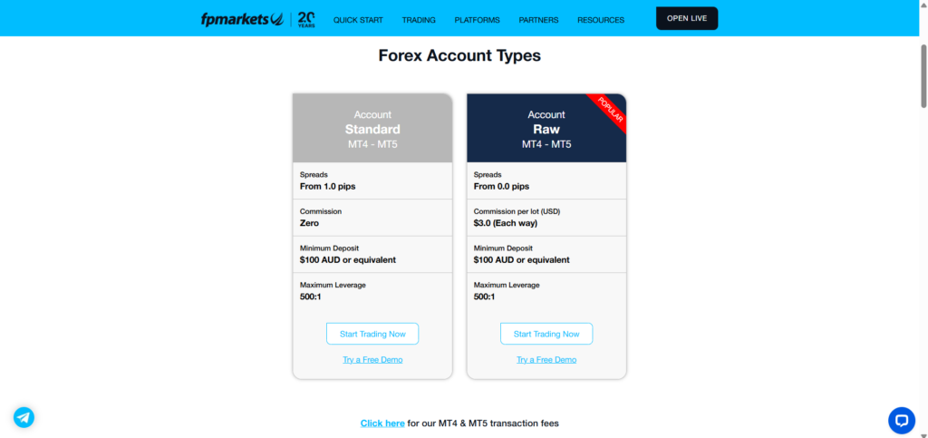 FP Markets offers 2 account types for FX traders: Standart account and Raw account. Both accounts are supported by the MT4 and MT5 platforms as well as their mobile apps. The minimum initial deposit is 100 AUD for both and they both offer the same amount of instruments and up to 500:1 leverage.