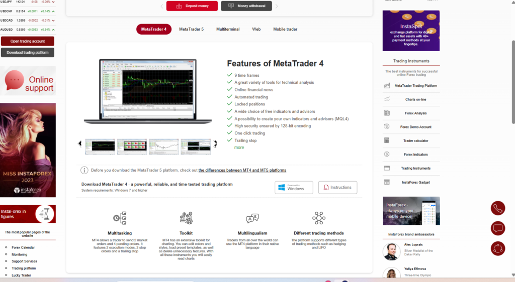 InstaForex provides access to both mobile apps and a web trading terminal. The mobile app enables traders to view live charts, place different order types, and monitor trades. Mobile versions of MetaTrader 4 are available in both Google Play and the Apple App store. App trading is an essential tool for dealing with emergency situations such as internet problems, power outages, etc.