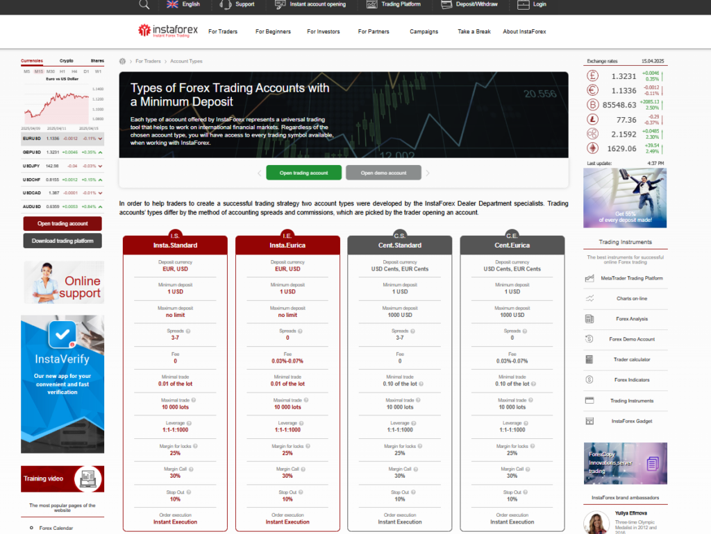 InstaForex is a multi-asset broker that provides access to trading Forex, commodities, indices, cryptocurrencies, and shares as CFDs. The broker offers various account types to meet the needs of different traders. There are no minimum initial deposit requirements and traders can start depositing from 1 USD.